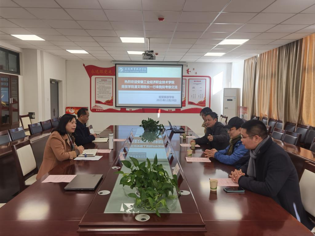 12月28日,安徽工业经济职业技术学院商贸学院院长潘文明、国贸与跨境电商教研室主任朱颖、电子商务教研室主任武迪、地质与建筑工程学院(珠宝学院)地矿教研室主任李孔亮一行4人来经贸旅游学院考察交流。该院院长赵红、副院长刘圣春,合职-梦森双创基地负责人、安徽梦森科技有限公司总经理吴捷在经贸楼会议室接待了来访客人。交流会由赵红主持。