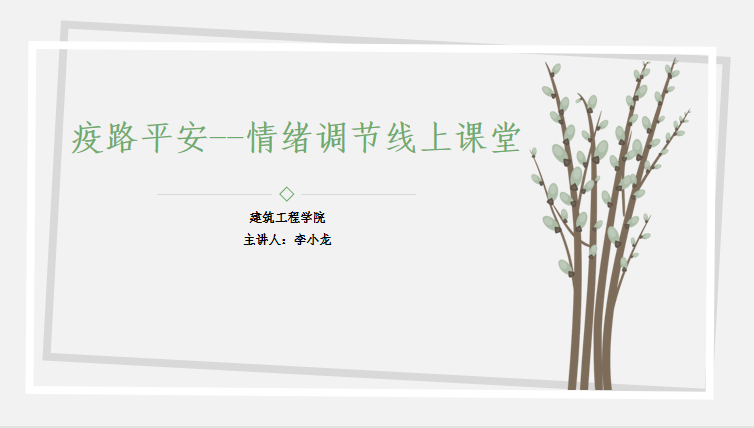 及时加强心理疏导,做好人文关怀,是做好校园疫情防控工作的重要一环。为了让学生更好的调适情绪状态,3月24日晚7点,建筑工程学院李小龙老师为在校班级全体心理委员开展了一场线上心理讲座。