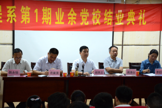 典礼第六项,院党委副书记胡其云同志作讲话。他强调,业余党校培训的面还要进一步扩大,每个学员都要坚定信仰,做时代的开拓者、奋进者;要扎扎实实做事、踏踏实实扎实做人。他又提出几点希望:希望学员们要坚守向上向善的正能量;要培养创新创业的能力;再近的距离,也要跑着去,年轻就是力量,有梦就有未来;要时刻修正自己做好表率,逐步成为真正的青年马克思主义者。