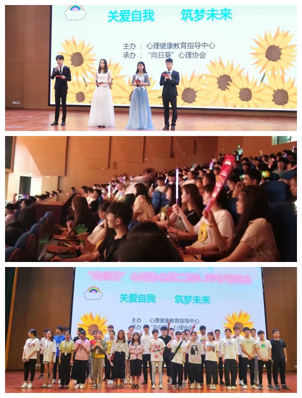 5月24日晚,申博太阳城第二届向日葵心理协会5•25专场晚会在汇心湖校区大学生活动中心礼堂举行。本次活动是“5·25”大学生心理健康月系列活动之一,由学生处心理健康教育指导中心主办,“向日葵”心理协会承办。学生处、心理健康教育指导中心老师,各二级学院书记、心理健康老师以及学生代表共400余人观看了晚会。