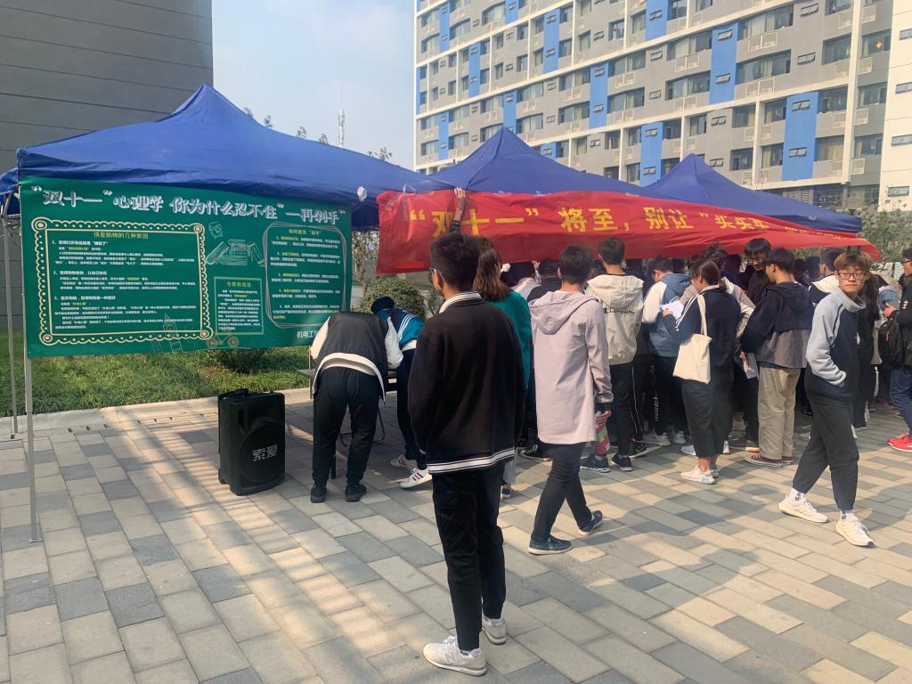 每年11月11日,一些大型电商网站都会进行大规模的打折促销活动,大学生作为网购的主力军,常有因便宜而购买不必要商品的行为。为避免学生盲目消费,树立大学生正确的理财观念,机电工程学院于11月8日在汇心湖校区食堂门口开展理性消费宣传活动,活动主题为“双十一将至,别让买买买,变成悔悔悔”。