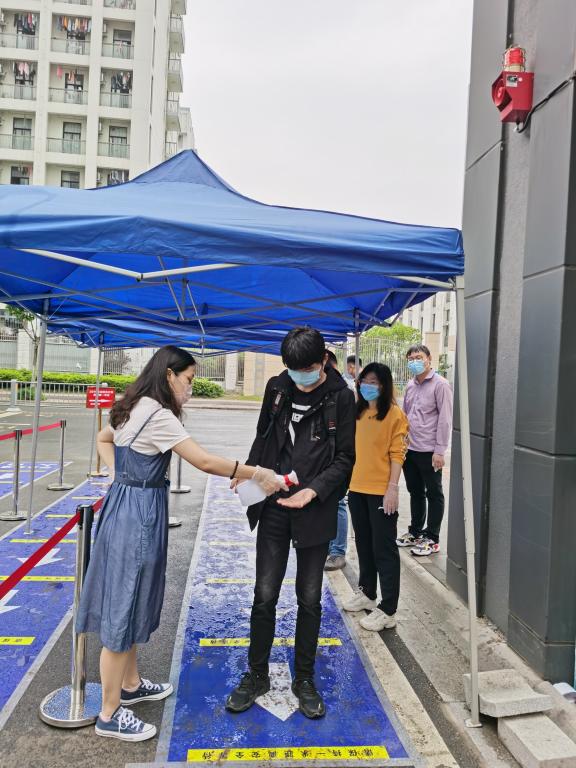 上午老师们早早地来到了学校北门,伴随着春雨绵绵和校园的芬芳静待学子归来。8时30分,首位返校学生来到了北门,在老师们的引导下顺利进入校园。学生返校前院党总支副书记(主持工作)王克勇已做了详细的工作要求,并结合《机电工程学院2020届毕业生返校工作流程图》对现场人员进行了明确分工与安排,保证了当天返校工作有条不紊的进行。返校现场同学们间隔一米以上,有序排队入校。每名进入校园的学生需依次完成测量体温、安康码核验、双手消毒、口罩更换、身份验证、入校登记、发放《返校指南》等流程,一切正常后方可进入校园,体温如有异常情况将由工作人员引导到留观室由校医院医生处理。