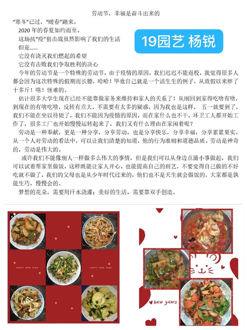 节日期间,活动开展得如火如荼,该院大学生通过为家人做一顿饭、全家大扫除、下地干农活等多种方式来炒热劳动节日的气氛。节后,收获了近百份学生劳动材料。经层层评选,最终我院诞生了十佳劳动之星!