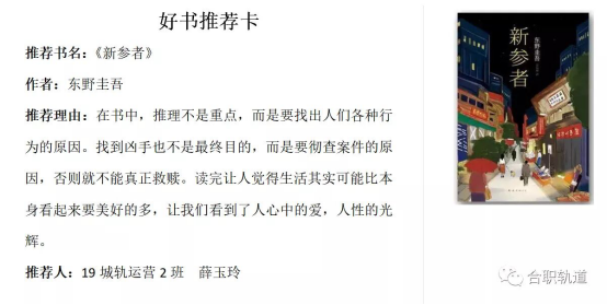 同学们截取了书中最喜爱的片段,分享了读书的照片、读书的感受以及书本带来的积极影响。通过学院微信公众号投票,最终选出19城轨信号1班邢宇航等13名最佳分享者。