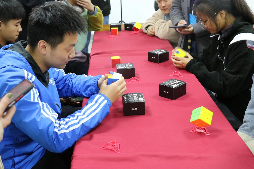 比赛开始前,由生物工程学院团总支兼职副书记钱九旭主持发言,预祝本次比赛的顺利开展。接着,裁判员宣读了此次比赛的意义和比赛的规则。比赛分为初赛与决赛,决赛分为两组,四人一组,四名裁判员共同参与计时评分。比赛过程中,魔方随机打乱顺序,选手们以智慧加速、与时间赛跑,魔方在他们手中快递翻转,大家争分夺秒将魔方复原。选手们的精彩表现赢得了在场老师的肯定和观众们的热烈掌声,参赛者更是信心倍增,速度越来越快,各不相让,展现了自己的能力和风采。