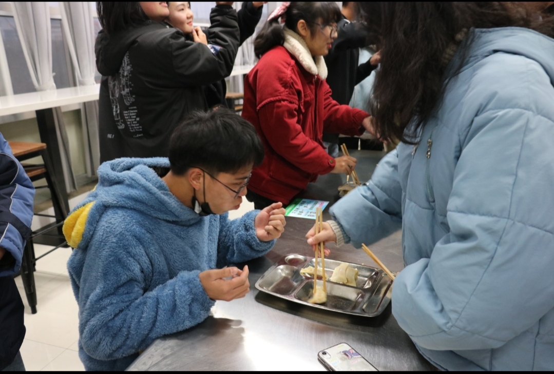 在一片欢声笑语中,饺子出锅了。在同学们品尝饺子的同时,吃饺子大赛也同时举行。每个部门出两名人员参加,一名负责吃一名负责喂,率先吃完10个饺子的队伍胜利,现场的比赛十分激烈,观看的同学更是乐开了花,最后由文礼部夺得了本次比赛的第一名。同学们吃着自己包的热腾腾的饺子,感受到了冬至第一口饺子的温暖。