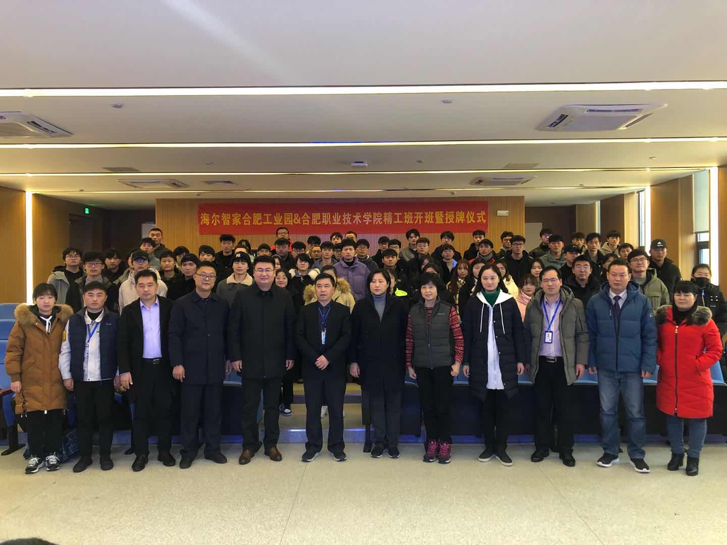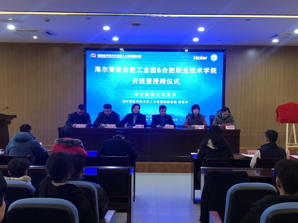 12月29日下午,机电工程学院与海尔智家合肥工业园精工班项目开班暨授牌仪式在汇心湖校区图书馆一楼学术报告厅举行。经开区人力资源中心副主任郑静、经开区人力资源中心企业服务部部长焦妮娜、海尔智家华东大区人力资源高级经理柯艮东一行、安徽爱沃客信息科技有限公司高级顾问纪丽一行、校党委副书记胡其云、机电工程学院党政领导班子成员、精工班全体同学及相关专业教师参加项目开班授牌仪式。