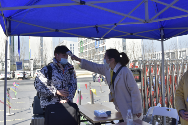上午八点,学院工作人员在学校西门口入校通道准备就绪,迎接返校学生的归来。工作人员对返校同学进行了健康码核验、体温检测、核对身份信息、扫码签到等流程,耐心引导学生入校。细致周到的服务让学生感受返校回家的温暖,返校报到现场秩序井然、其乐融融。