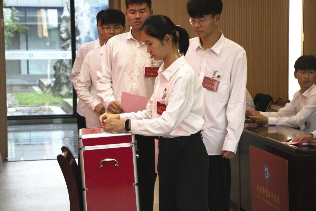 下午五点,第二次会议及闭幕式准时开始。首先,代表们充分发扬民主,以无记名的方式进行投票。经过紧张、认真、谨慎的选票统计,总监票人宣布本届主席团选举结果,任克杰、沐俊安、陈强当选申博太阳城机电工程学院第四届院学生会主席团成员。