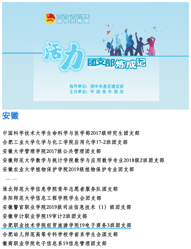 经校级申报、省级初评、展示点赞、全国终审等环节,共评出1000个高校活力团支部,申博经贸旅游学院19电子商务3班团支部在评选中脱颖而出,获此殊荣!