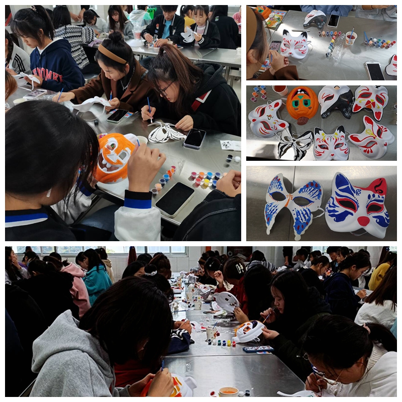 本次面具DIY活动主题为“飞扬中国梦,彩虹合职情”,两校区近300人参加了此次活动。活动现场充满了欢声笑语,同学们放飞思绪,描绘创意,用心勾勒,每一幅面具都绚丽多彩,每一幅面具都表达着喜怒哀乐,每一幅面具都有自己的灵魂。完成作品后戴上自己亲手设计绘制的面具,和同学一起拍照留念,或者录制一个小视频,发送给亲人、朋友,记录生活,分享快乐。