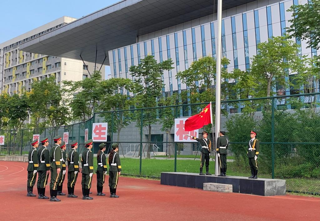 伴随着清晨的第一缕阳光,英姿飒爽的国旗护卫队队员,迈着铿锵的步伐护送着五星红旗来到国旗台前。在激昂的《义勇军进行曲》中,升旗手振臂一挥,五星红旗冉冉升起,迎风飘扬,全体师生心潮澎湃地向国旗行注目礼,庄严肃立。