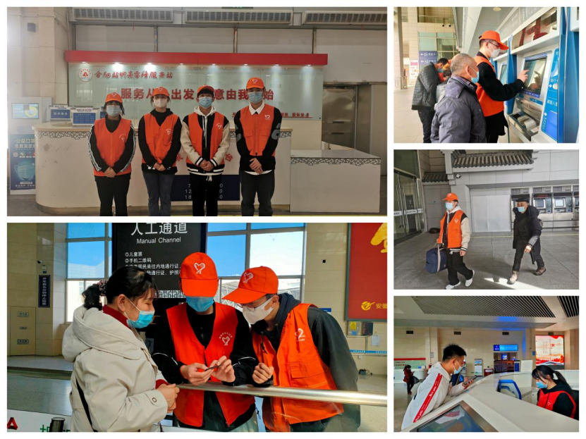 在经过合肥火车站工作人员的简单培训后,15名学生志愿者进行了分工,投入到此次志愿服务活动中,售票大厅、服务台、进出站口、候车厅等地方都活跃着志愿者们热情服务的身影,他们积极主动的为旅客提供行路指引,回答旅客的咨询,协助公共秩序引导,为老弱病残孕旅客提拿行李等等。“您好,需要帮助么?”“您好,我帮您拿吧!”一句句朴实的问候,一个微小的帮助,都得到了旅客朋友们真诚的感谢,也成为了火车站内一道亮丽的风景线。