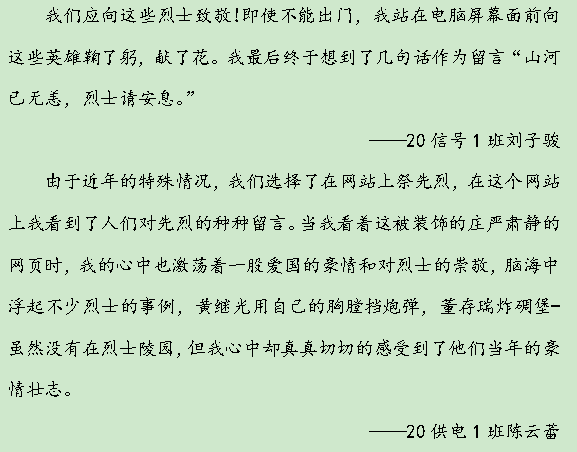 网上祭英烈 留言致哀思。为缅怀先烈,继承和发扬老一辈革命家的优良传统,轨道交通学院开展清明网上祭英烈系列活动。学生们积极登录中华英烈网站,一起为英烈们点燃清香、献上鲜花、敬献花圈,并向英烈们深深鞠躬,缅怀为民族为国家献出生命的英雄烈士,表达对革命先烈的敬仰之情和继承发扬革命精神的坚定决心。