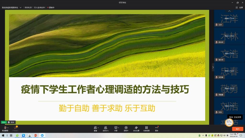 为使学生工作者勤于自助、善于求助和乐于互助,更好服务学生发展,4月18日下午,机电工程学院邀请校心理咨询中心主任张洁开展《疫情下学生工作者心理调适的方法与技巧》专题线上讲座。校党委委员、办公室主任王海,学院全体教职工、在校班级辅导员参加讲座,讲座由党总支书记王克勇主持。