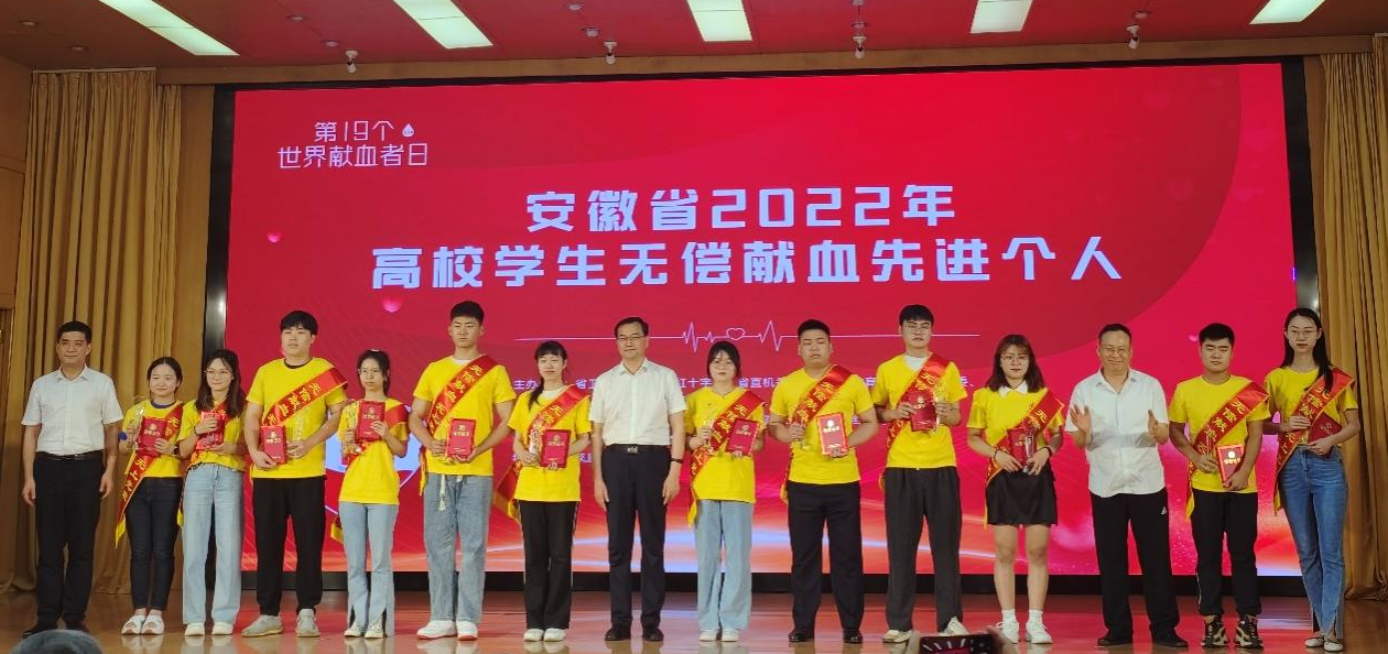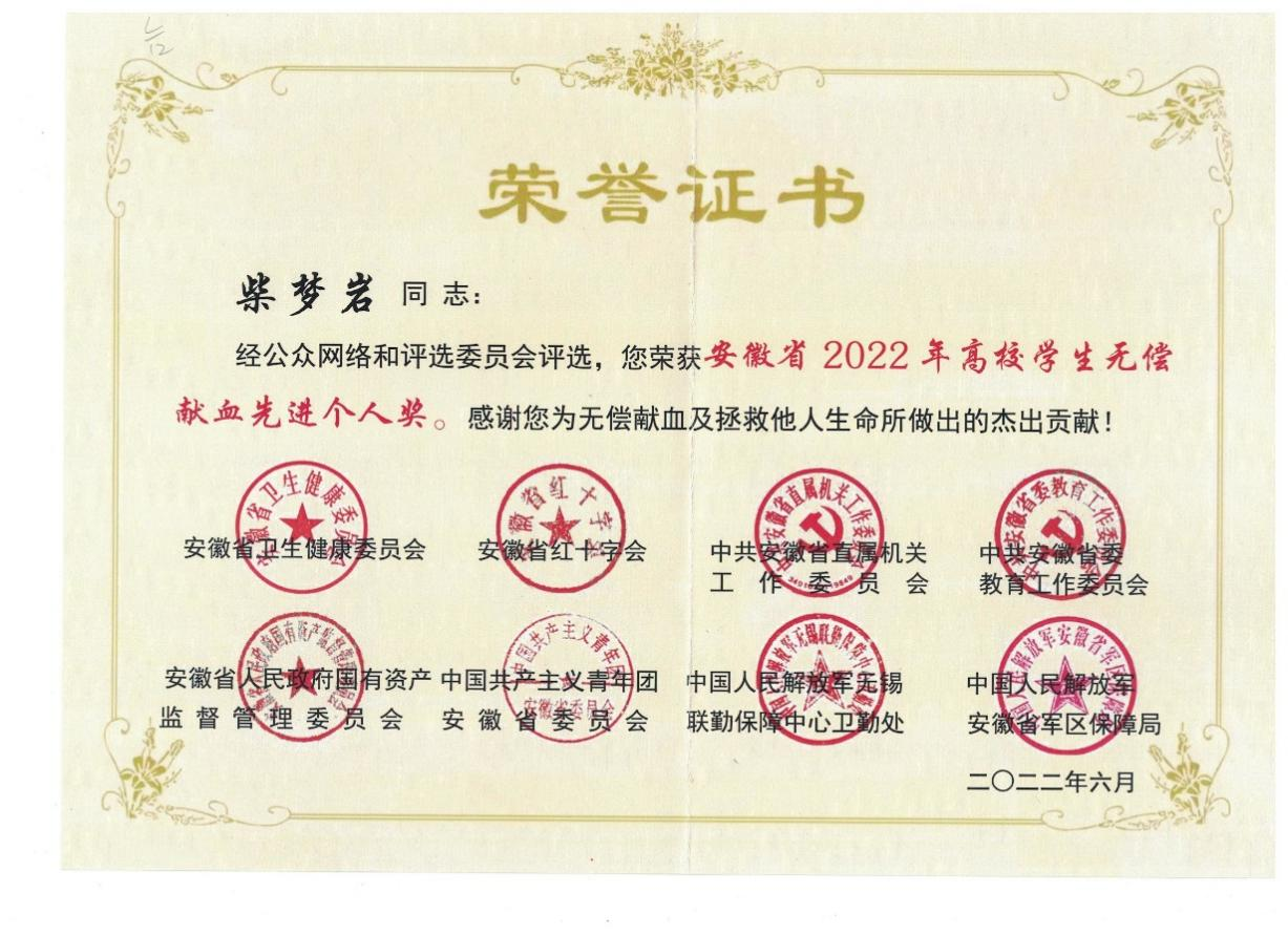 6月14日,在第19个“世界献血者日”到来之际,2022年安徽省无偿献血公益之星和先进个人评选结果在安徽省暨合肥市2022年“世界献血者日”主题宣传活动上顺利揭晓,医学院临床专业2021级柴梦岩同学荣获“安徽省2022年高校学生无偿献血先进个人”称号。