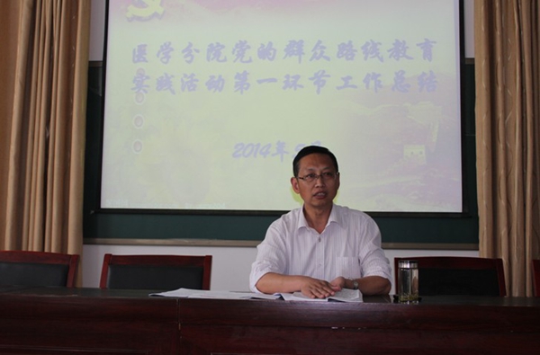 医学分院党总支于2014年5月14日下午在医学楼北楼会议室召开党的群众路线教育实践活动第一环节总结会议,医学分院党总支书记高恒平对教育实践活动第一环节作工作总结,医学分院教工和学生支部委员参加会议。