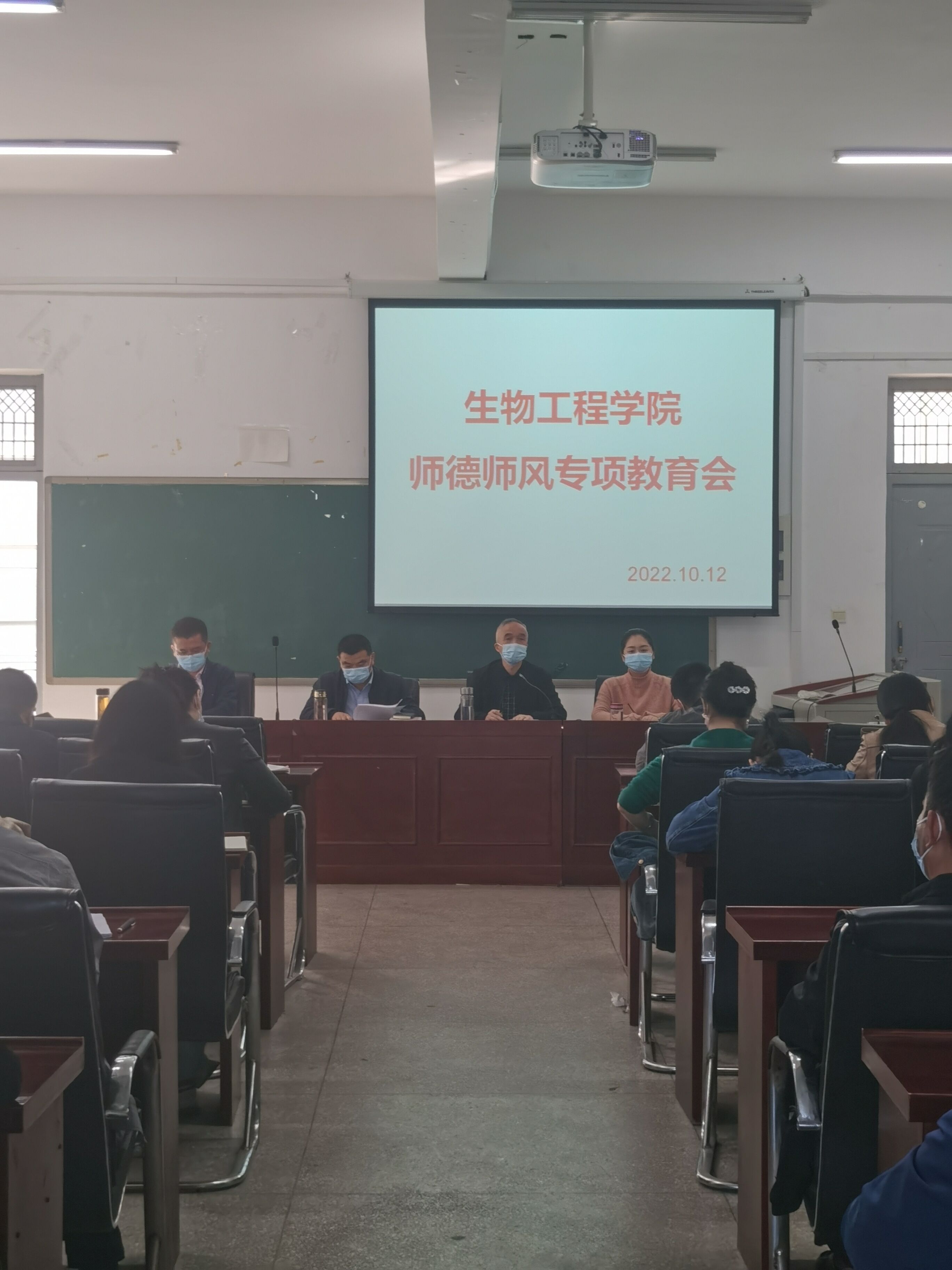 10月12日下午,生物工程学院在生化楼A305会议室召开师德师风专项教育会,会议由学院党总支书记汪春荣主持,全体教职工参会。