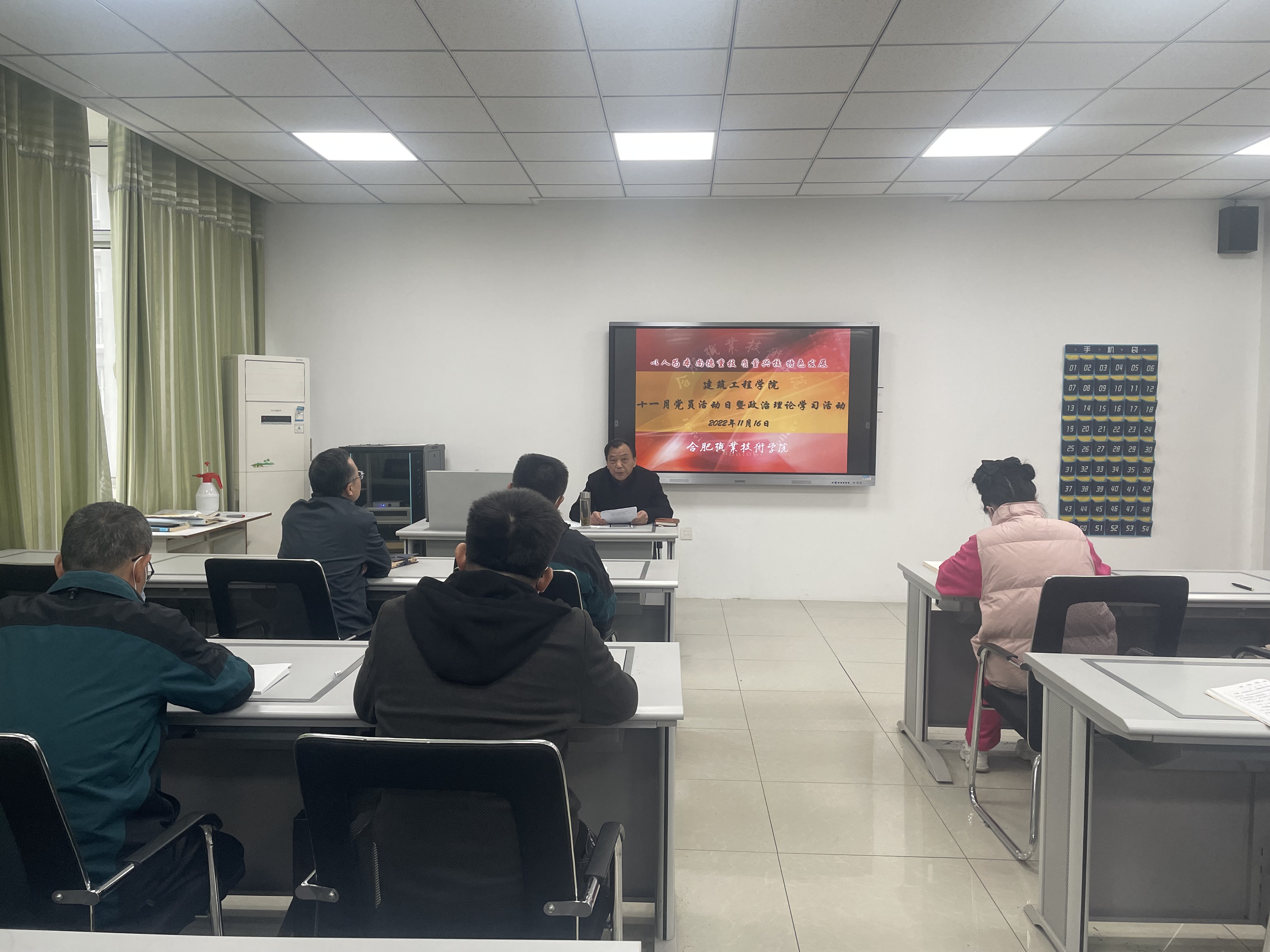 根据校党委统一安排部署,结合工作实际,11月17日下午,建筑工程学院党总支在建工楼301开展十一月份党员活动日暨教职工政治理论学习活动,全院教职工参加了会议,活动由该院党总支书记宁业群主持。