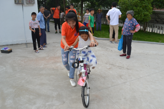 捐赠仪式结束后,志愿者们帮助小朋友组装自行车,手把手教孩子们如何骑车,还一起做游戏、唱歌、跳舞。歌声、笑声汇聚在一起,给孩子们带来一个爱意暖暖的暑假。
