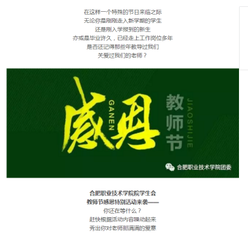 校学生会首先在微信公众号上向全校征集优秀祝福语。消息发出后,一石激起千层浪,大家的尊师重道情结瞬间被燃爆,很多同学发来祝福语,表达对合职教师的感谢之情。