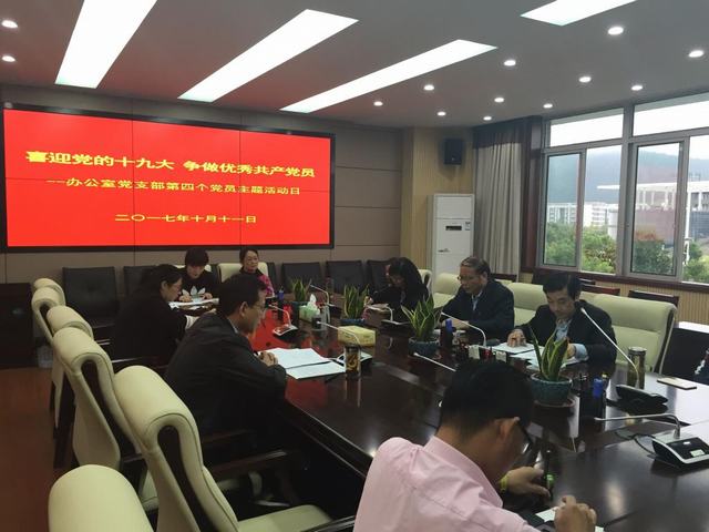 第二阶段,召开支部扩大会议,办公室党支部全体党员参会。会上,陈琳同志传达了学校组织部《关于认真组织开展第四个党员活动日的通知》;慈龙保同志宣读了支部第四个“党员主题活动日”实施方案;王海同志对即将召开的十九大会议的背景、意义做了深刻的解读。