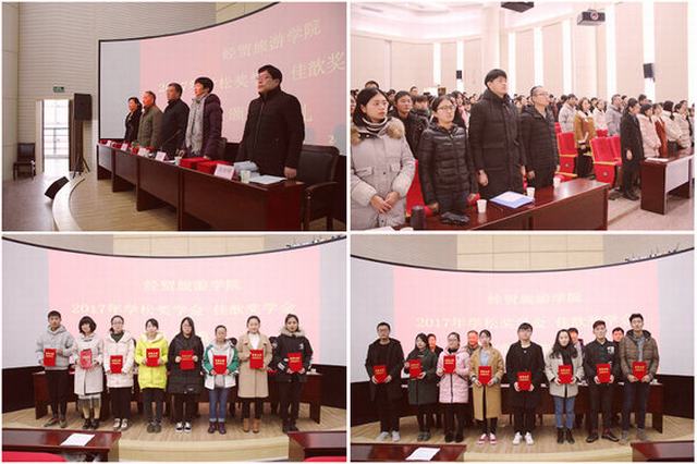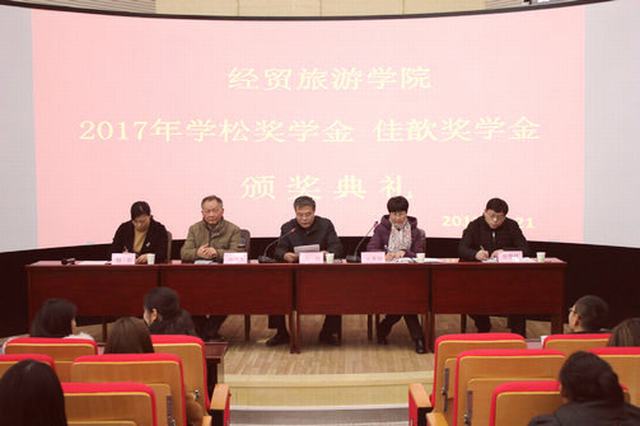 2017年12月21日下午,经贸旅游学院在学校图书馆二楼报告厅隆重举行2016-2017学年“学松奖学金”和“佳歆奖学金”颁奖典礼。校纪委书记、关工委主任金辉,校原关工委主任杨庆木应邀出席颁奖典礼。经贸旅游学院负责人,经贸旅游学院、建筑工程学院师生代表共计200多人参会。会议由经贸旅游学院党总支书记王秀珍主持。