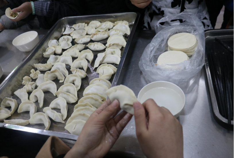 晚上的一食堂灯火通明,笑语盈盈。60余名学生分成六组围坐一起,共同为饺子事业奋斗着。女生自然是主力军,只见她们熟练地放馅料、蘸水、捏饺子,十指翻飞间,一只只精致的饺子就诞生了。不会包的学生也现场拜师学艺并成功出师,最后在大家的辛苦努力下,完成了近千只或胖或瘦、或扁或圆、形式各样的饺子。看着自己的劳动成果,同学们的成就感油然而生,纷纷感慨真像过年在家包饺子一样,热闹而有趣。