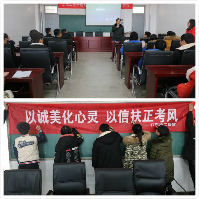 随后一些学生代表上台分享自己的学习方法和复习经验,希望同学们能够认真复习,为考试做好充足准备,避免考试作弊现象的发生。接着由班长代表全班同学宣读诚信考试倡议书,同学们在主题条幅上签下自己的名字,承诺诚信考试,从我做起。