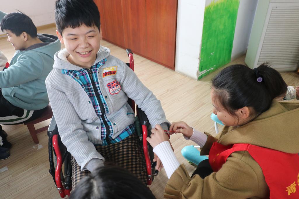 福利院的孩子多是因残疾或疾病被家人所遗弃,既有尚需抱在怀中的幼儿,也有三十多岁仍然无从走向社会的成人。他们热情、开朗,积极参与互动;他们懂得体贴、关心他人。虽然大多数孩子身体机能受损,智力有缺陷,但是脸上洋溢的笑容感染了每一位志愿者。一名女生默默摘掉手上陪伴自己多年的红绳,将它系到帮扶孩子的手腕上。这是一份心意的传达,更是一份祝福的寄托。