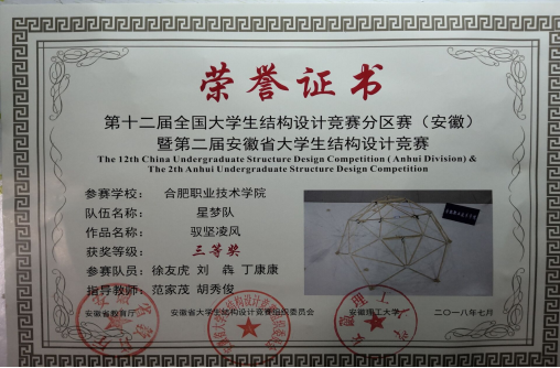 2018年5月17日至20日,申博建筑工程学院徐友虎、刘犇、丁康康等6名同学参加了由安徽省教育厅主办的第二届大学生结构设计竞赛,与省内19所本专科院校38支队伍同场竞技,申博“星梦队”的《驭竖凌风》作品最终荣获三等奖,虽然只是三等奖,却是本次竞赛唯一获奖的高职院校,成绩排名较上届有较大提升。